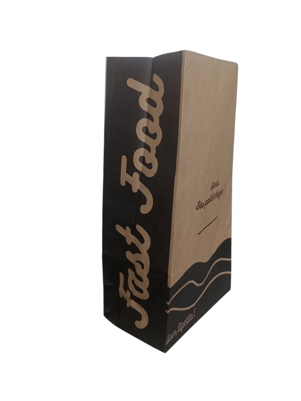• Design Profissional: Saco em Kraft Pardo com estampa em tinta preta nas laterais e frente, trazendo frases como "Fast Food" e "Chegou a Melhor Hora do Dia! Bom Apetite!". Agrega valor visual à sua marca.