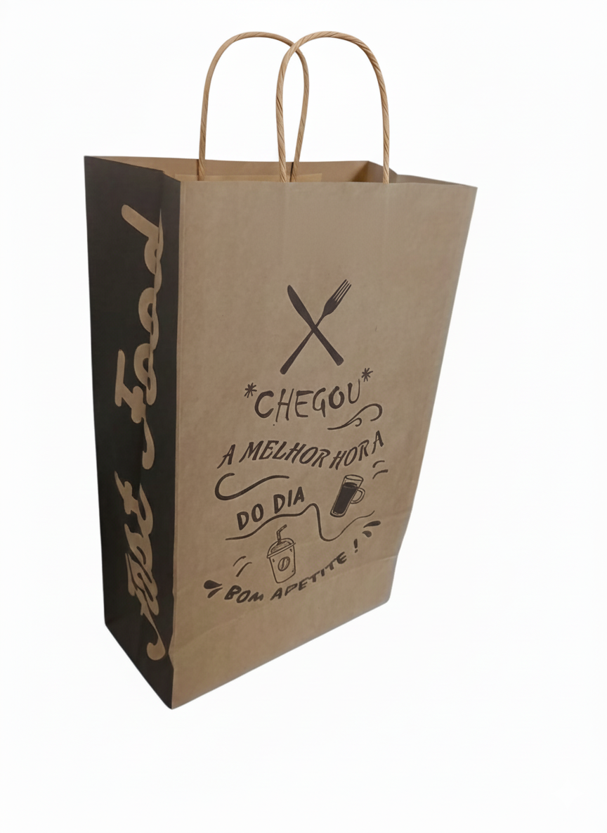 O produto destaca-se pelo seu design com alças de papel torcido e estampa em preto que diz "CHEGOU A MELHOR HORA DO DIA", e " SORRIA SEU PEDIDO CHEGOU" agregando valor e um toque personalizado à experiência do cliente.