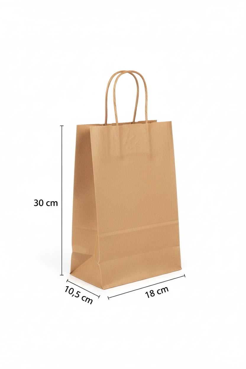 sacola com 100 de papel Kraft, no Tamanho P. Possui as dimensões 18x30x10,5 alça 9 cm