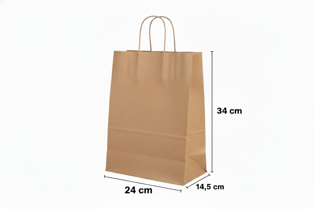 O acabamento natural em papel pardo permite uma versatilidade única, adaptando-se desde lojas de vestuário a delivery de produtos artesanais.
